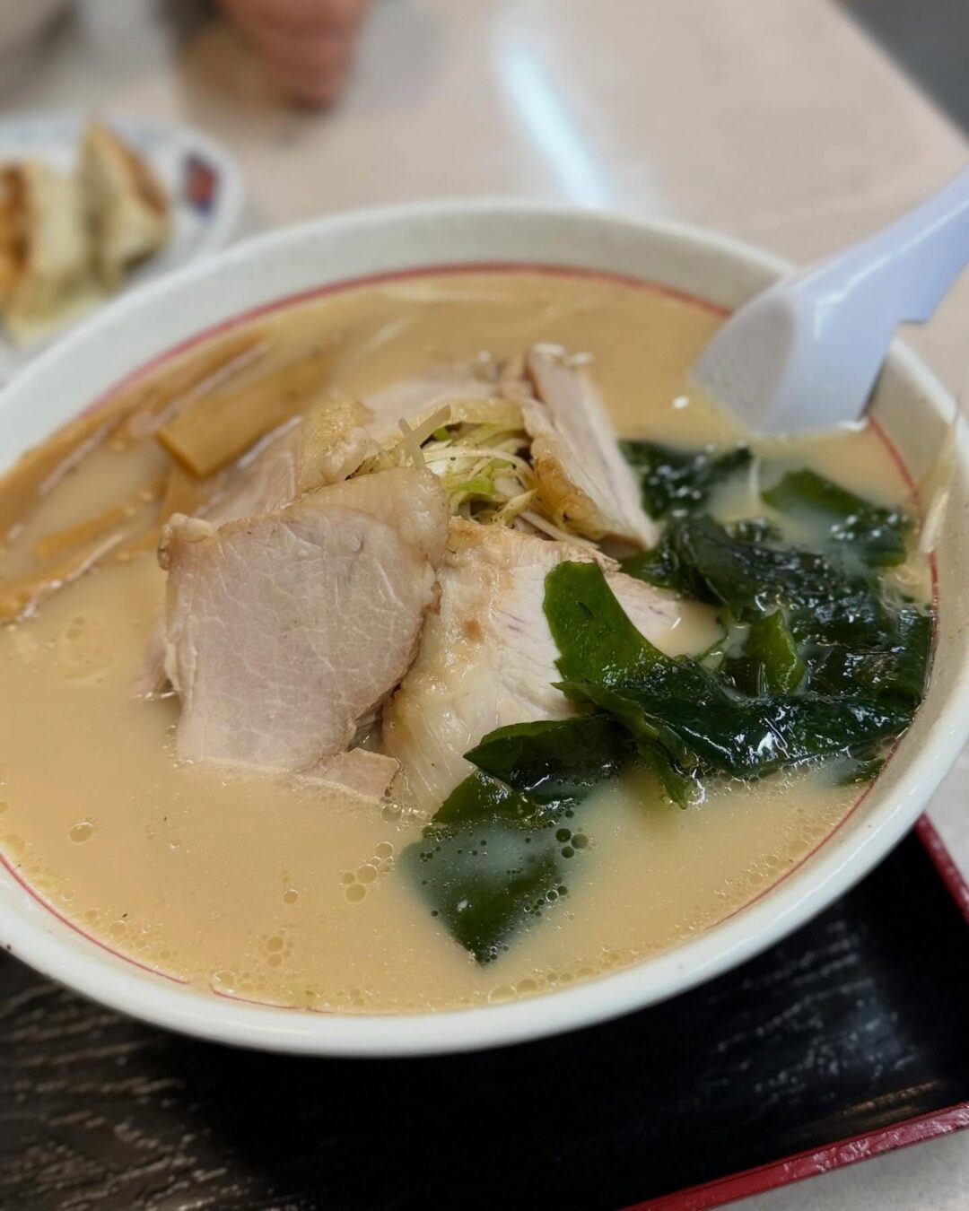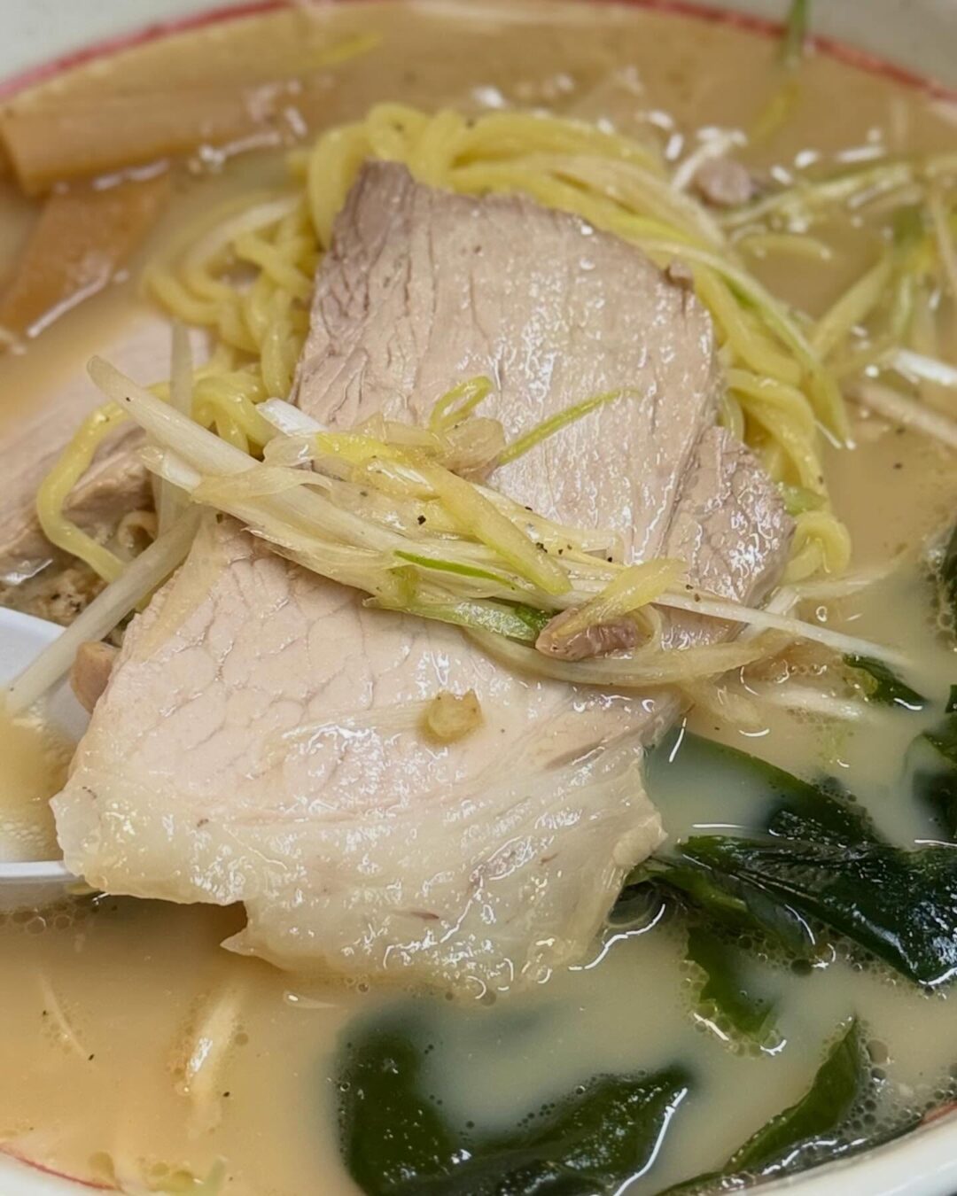 スープは豚骨ベースで、ひと口すするとコクのある旨みに加えてピリッとした辛さが広がります。