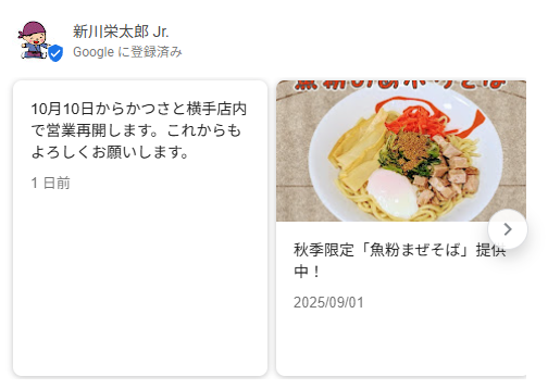 営業日や提供時間などの詳細は、Googleマップの店舗情報にある「オーナー」投稿欄で随時更新されています。