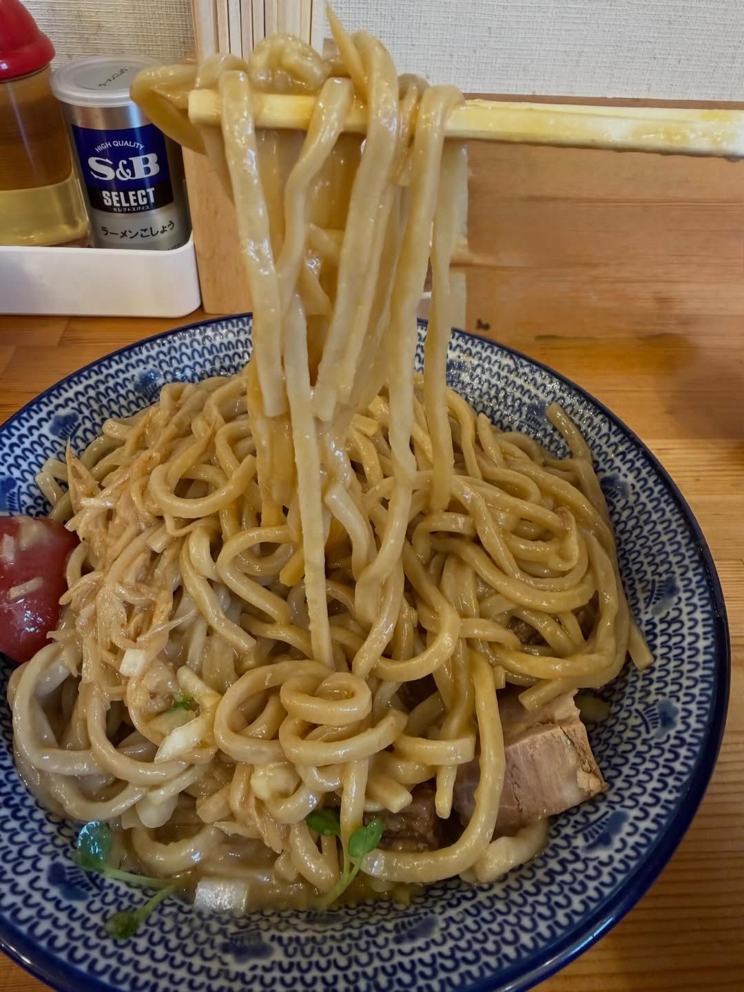 太ストレート麺に濃いめのタレがしっかり絡みつき、一口ごとに力強いうまさが押し寄せてきます。