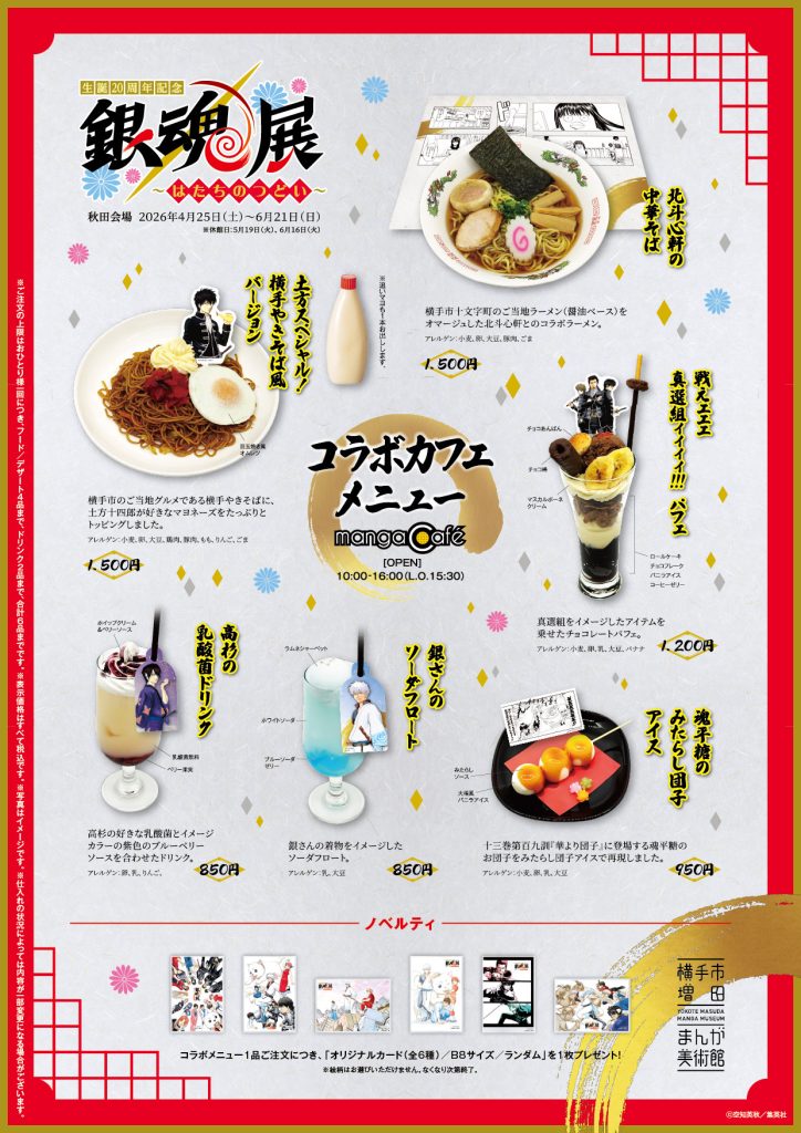 横手市増田まんが美術館内の #マンガカフェ では4/25(土)~6/21(日)まで「生誕20周年記念 銀魂展 ~はたちのつどい~」秋田会場とのコラボメニューをご提供✨