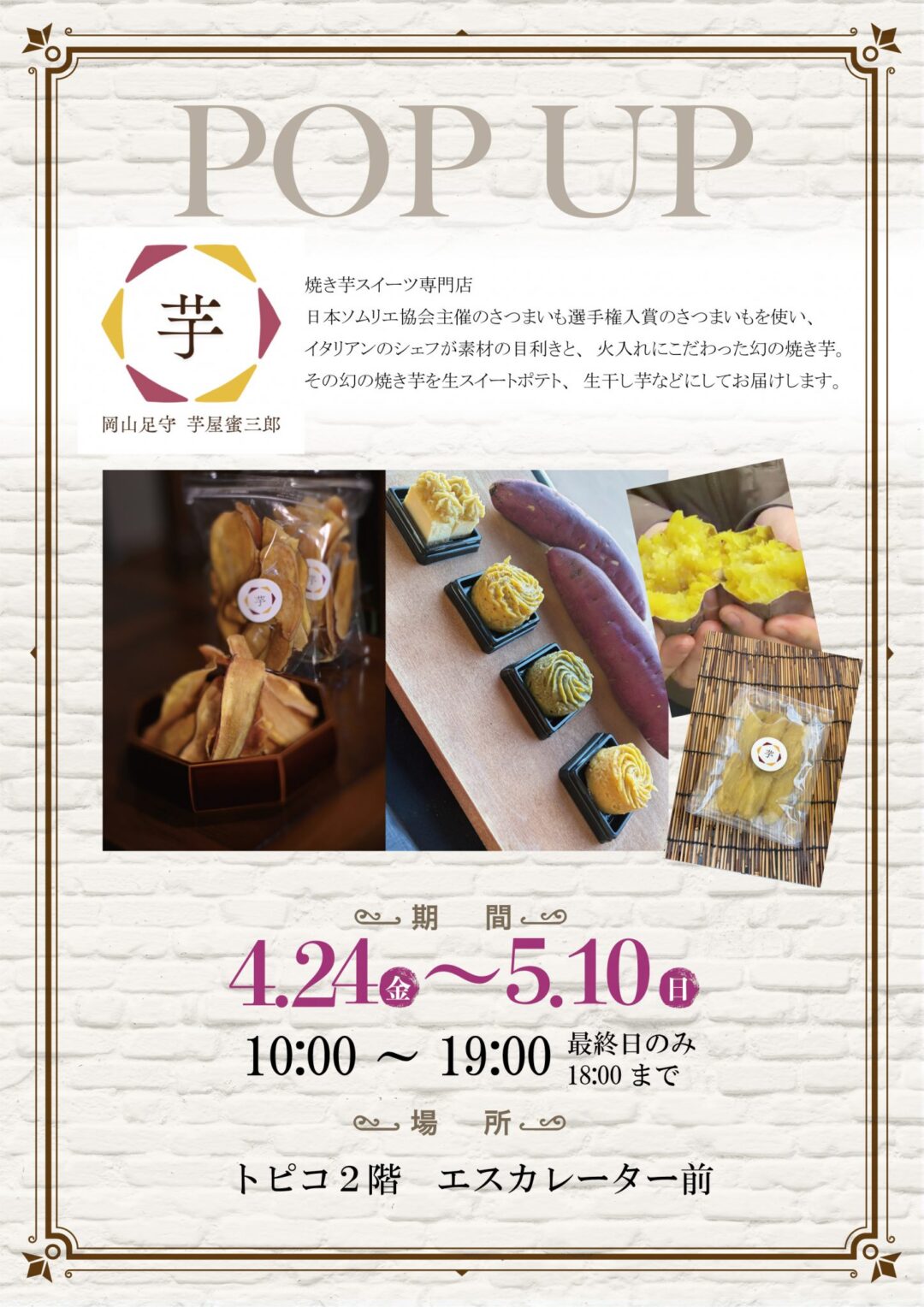 秋田駅直結の秋田駅ビル トピコ2階に、焼き芋スイーツ専門店「芋屋蜜三郎」が期間限定でオープンします。