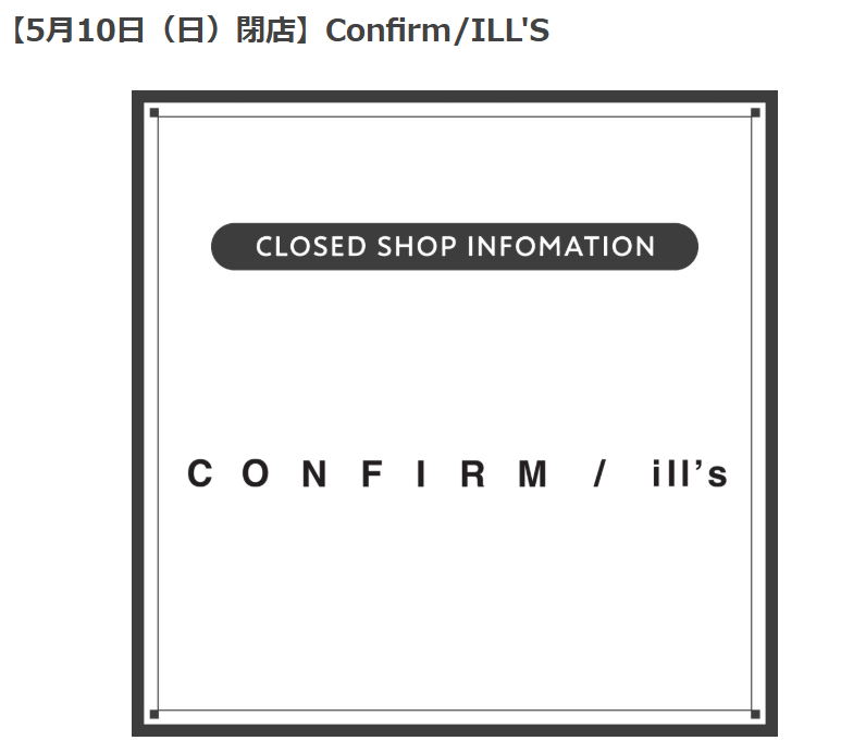 イオンモール盛岡にあるConfirm/ILL’S(コンファーム・イルズ)が、2026年5月10日(日)をもって閉店することが発表されました。