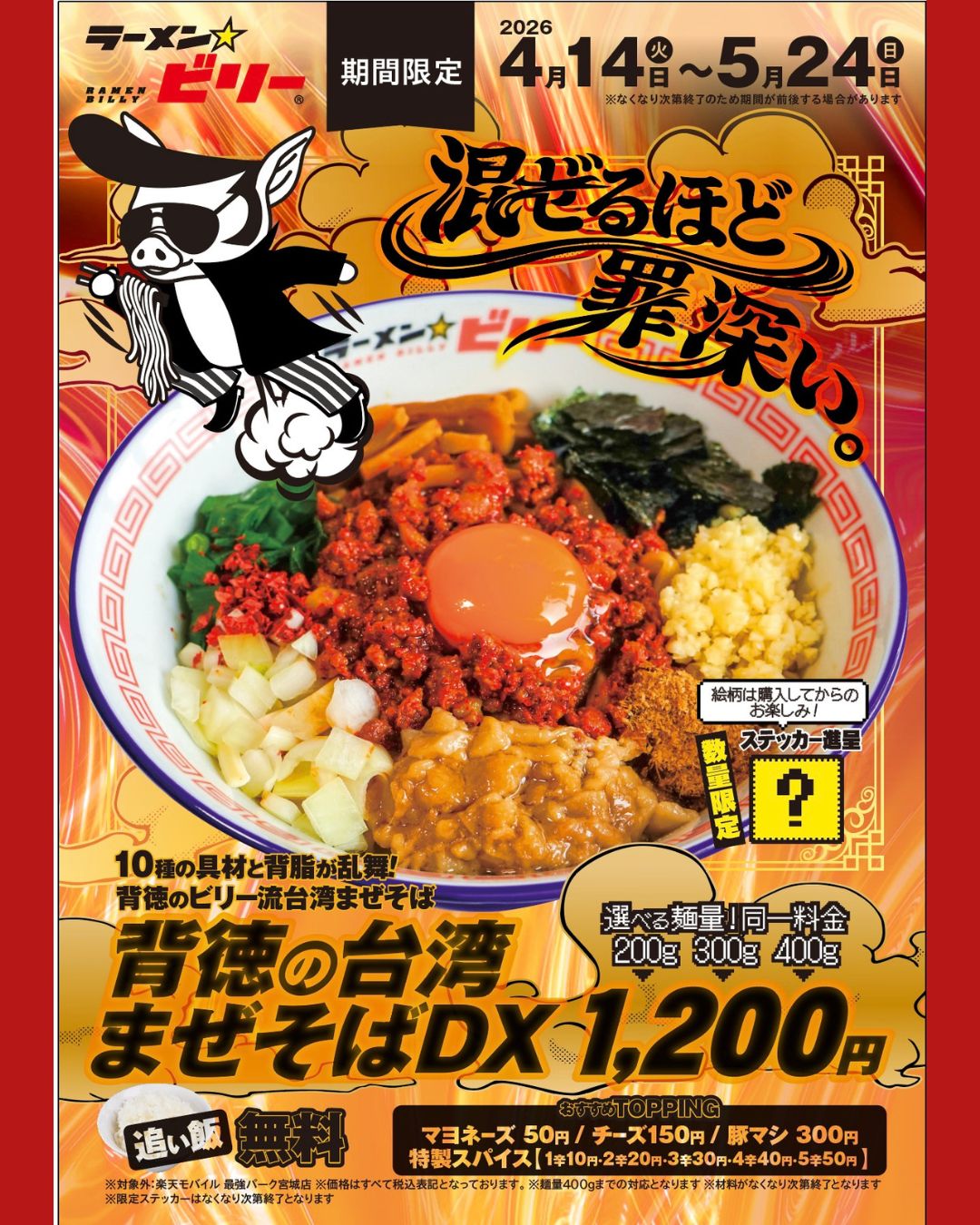 【秋田県からも注目】ラーメン☆ビリー盛岡フェザン店で限定「背徳の台湾まぜそばDX」登場!