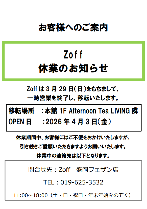 Zoff 盛岡フェザン店が、2026年4月3日(金)に移転オープン予定です。