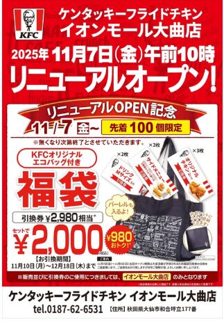 2025年11月7日(金)、秋田県大仙市の「ケンタッキーフライドチキン イオンモール大曲店」がリニューアルオープン予定です。