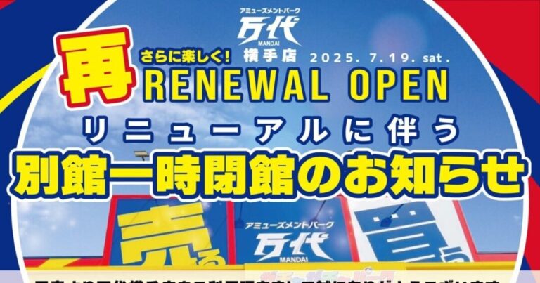 秋田県横手市にあるアミューズメントパーク「万代横手店」の別館が、再リニューアル工事に伴い2025年5月19日(月)〜7月18日(金)の期間、一時閉館となることが発表されました。 今回の一時閉館は、より楽しく快適な施設づく … 続きを読む アミューズメントパーク万代横手店別館が一時閉館へ。再リニューアルに向けた期間限定の対応