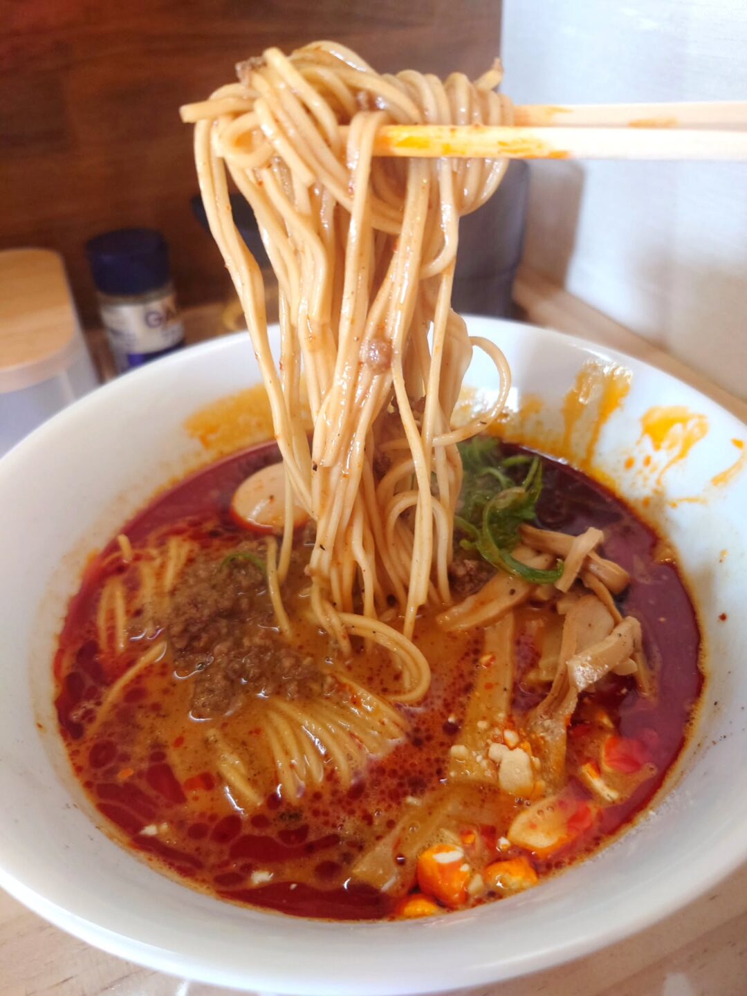 細ストレート麺は啜りやすく、担々スープとしっかり絡むバランスの良さが印象的。