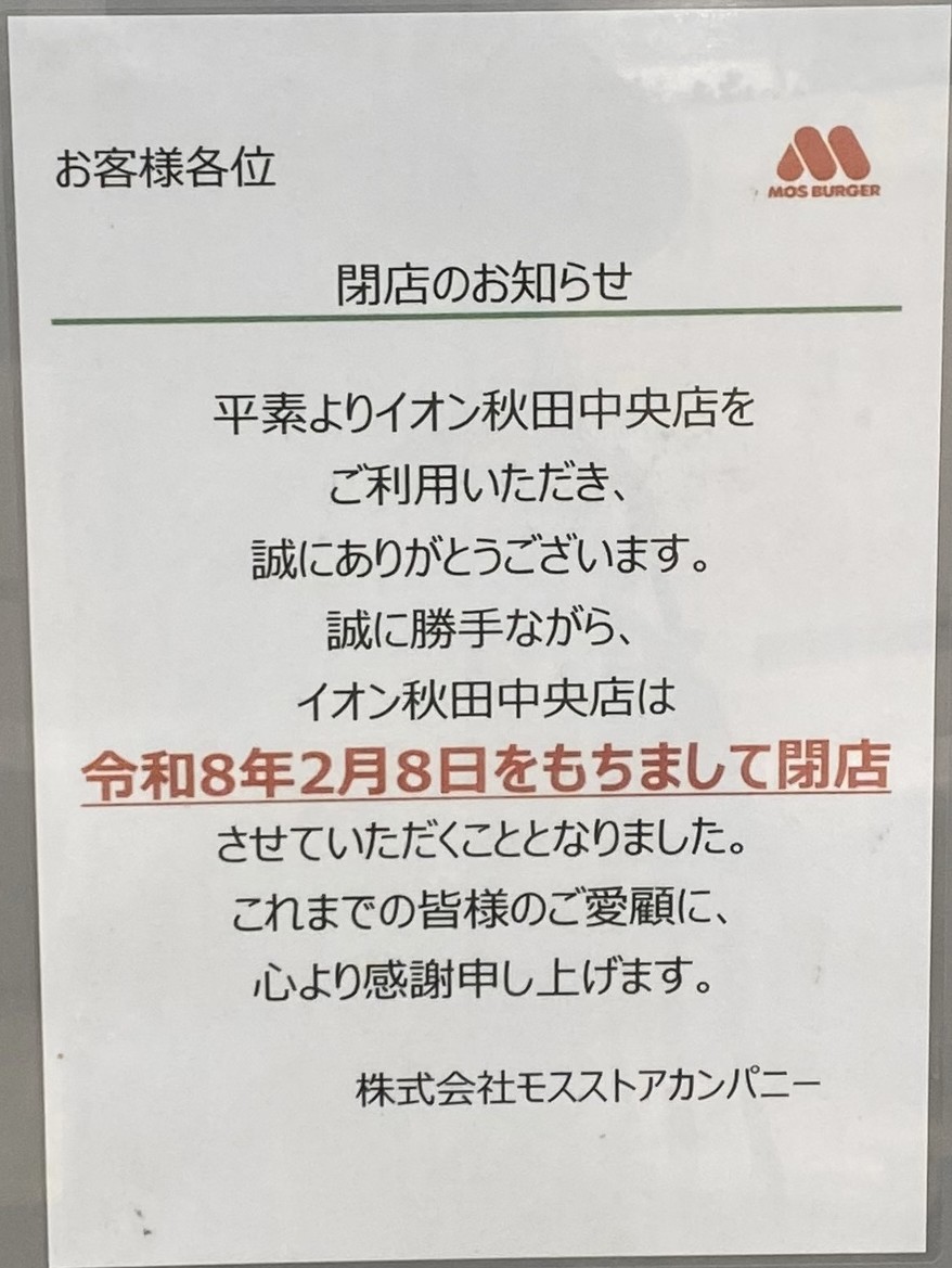 秋田県秋田市にある「モスバーガーイオン秋田中央店」が、2026年2月8日の営業をもって閉店することがわかりました。