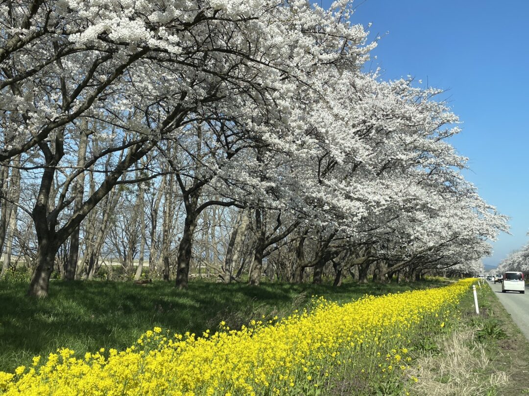 大潟村を走る県道沿いに、約11キロにわたって桜と菜の花が咲き続けています。