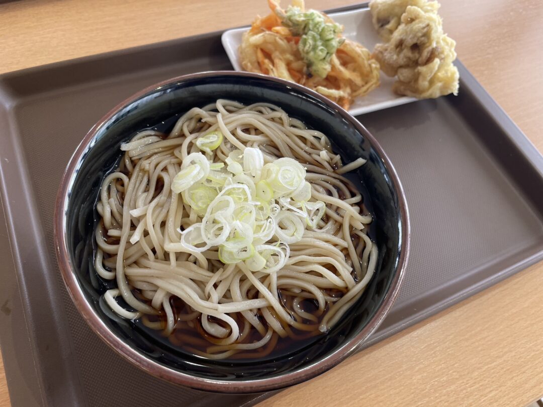 西馬音内そば(冷がけ・大盛)。ネギトッピングは無料。「舞茸の天ぷら」「かき揚げ」をトッピングしました!