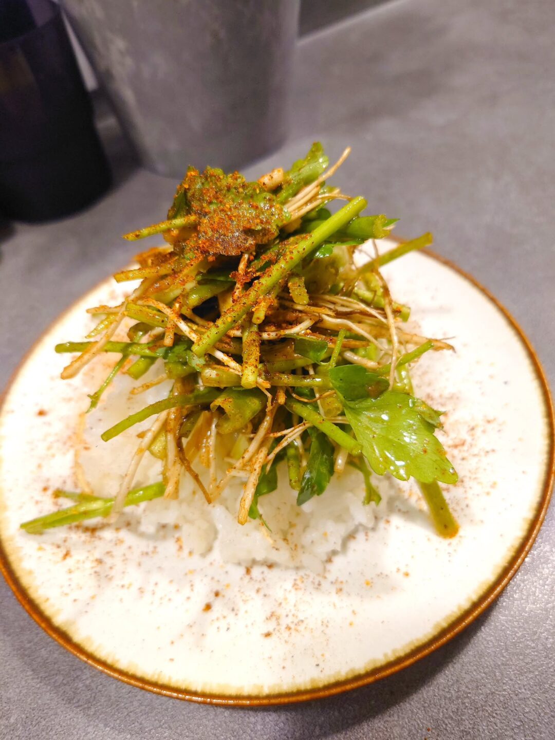 シャキシャキとした芹の食感と爽やかな香りが、濃厚な油そばの合間にちょうどいいリセット役になります。