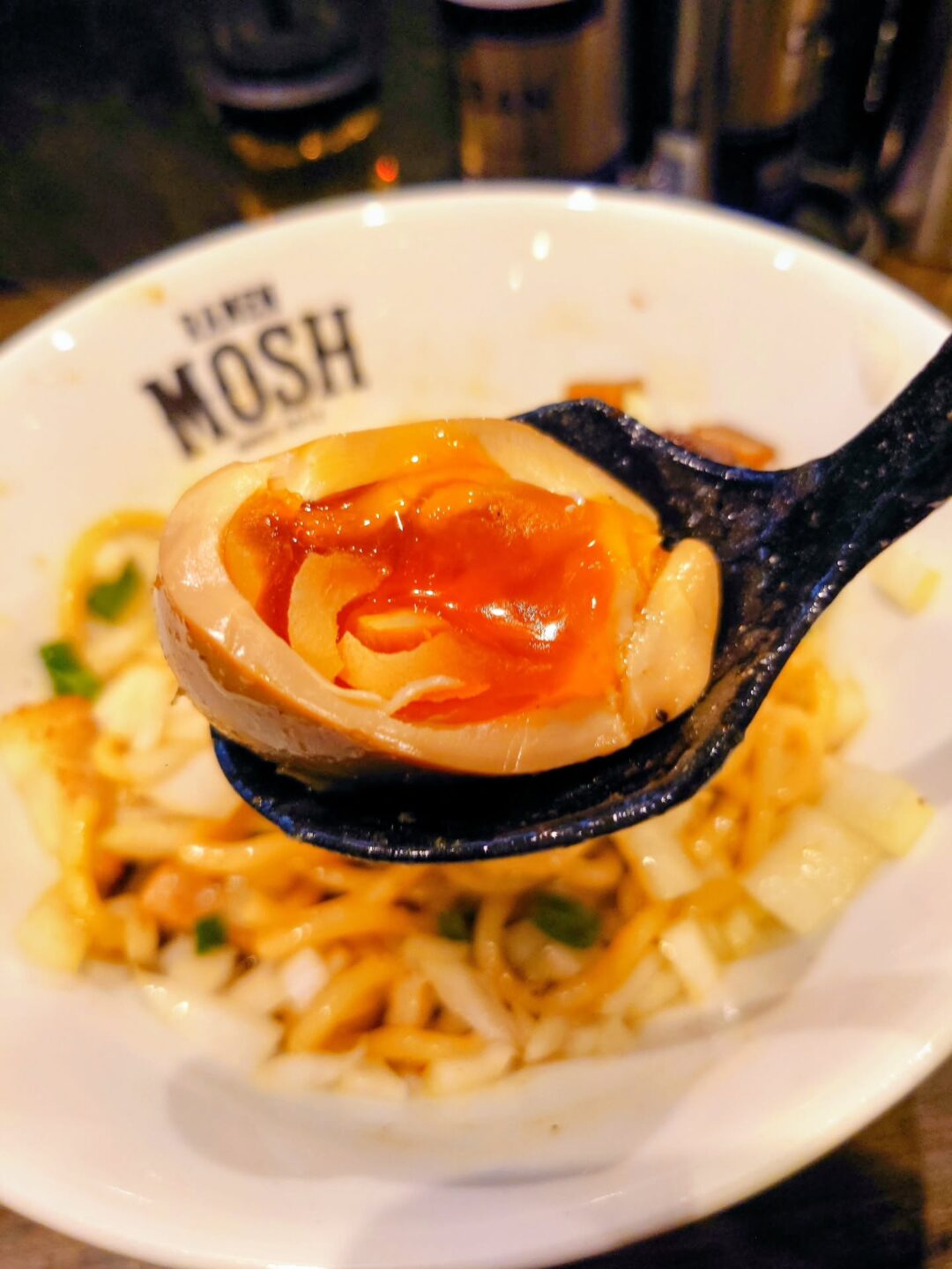 トッピングの味玉はコク深く、玉ねぎ増しのシャキシャキ感が絶妙なアクセント。