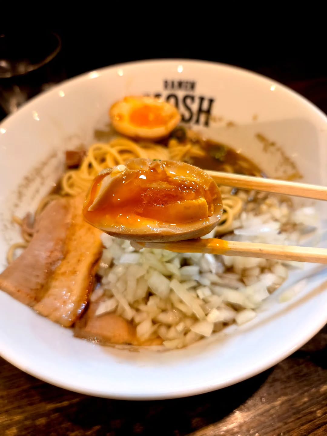 とろりとした黄身がたまらない味玉も安定の存在感。そして今回は玉ネギをダブル増し。