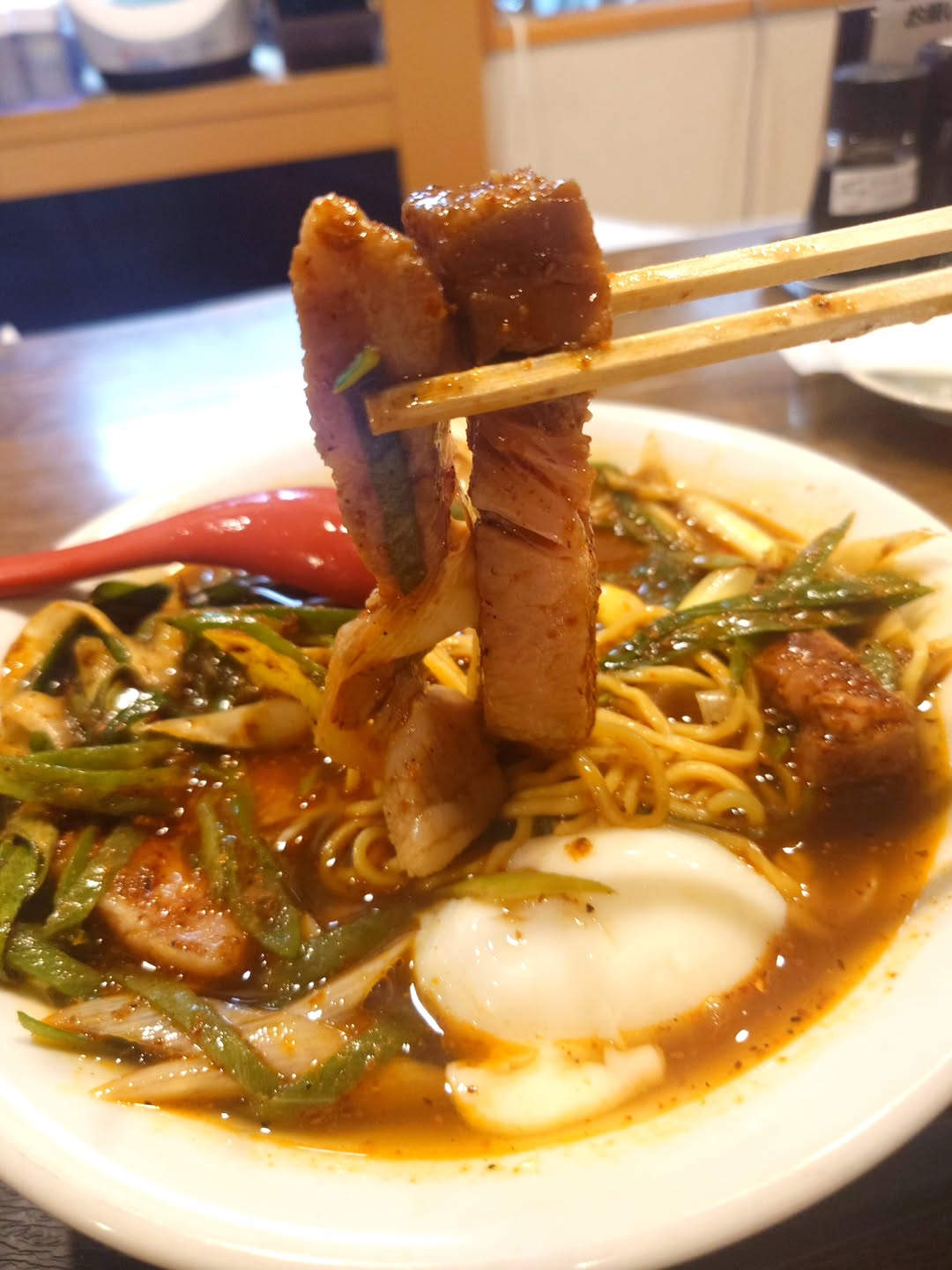 厚切りチャーシューは旨辛スープをしっかりまとい、存在感抜群。