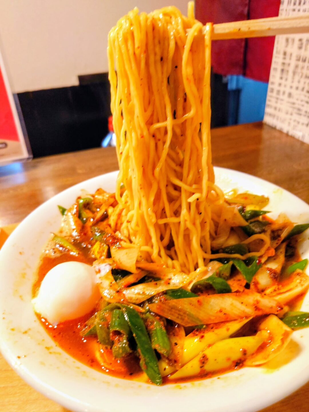トッピングの温玉を崩すと、辛味がまろやかになり味の変化も楽しめます。