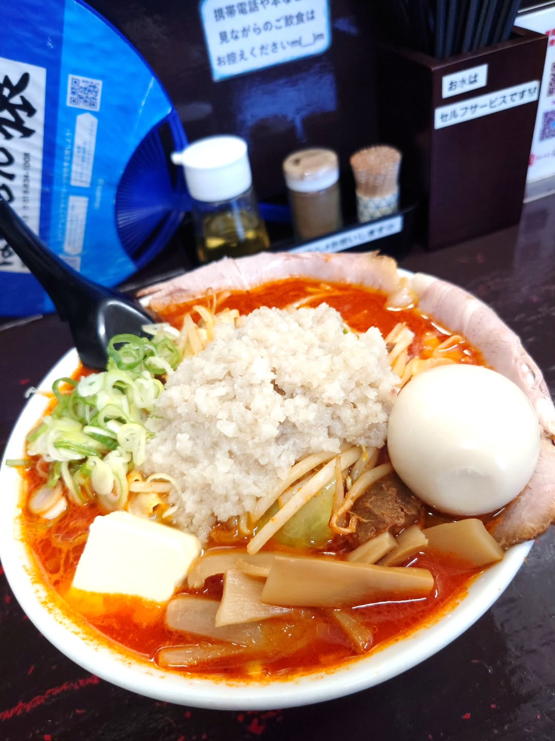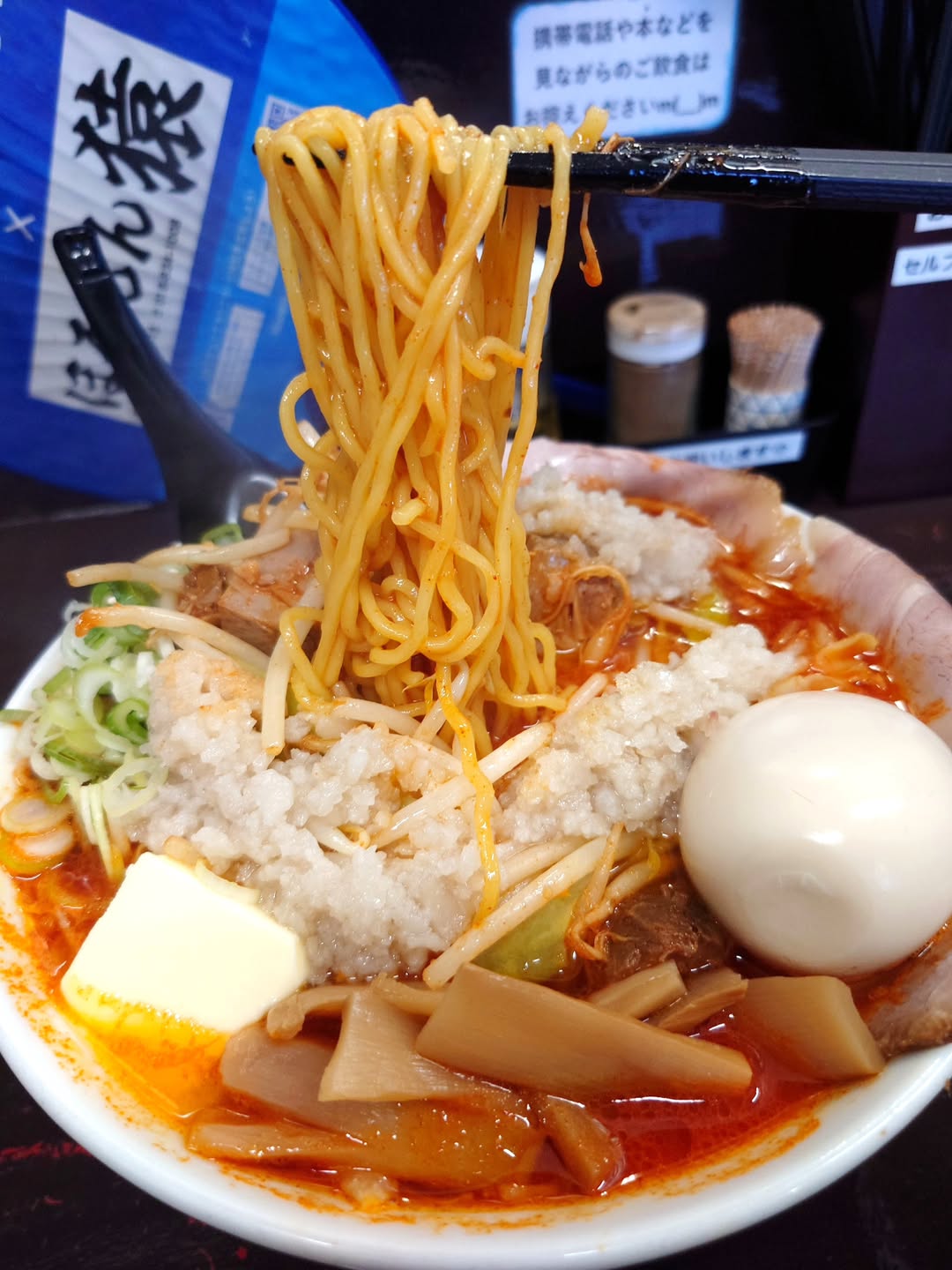今回は味玉・コロチャー・辛味・バター・背脂の“フルコンボ”で注文。