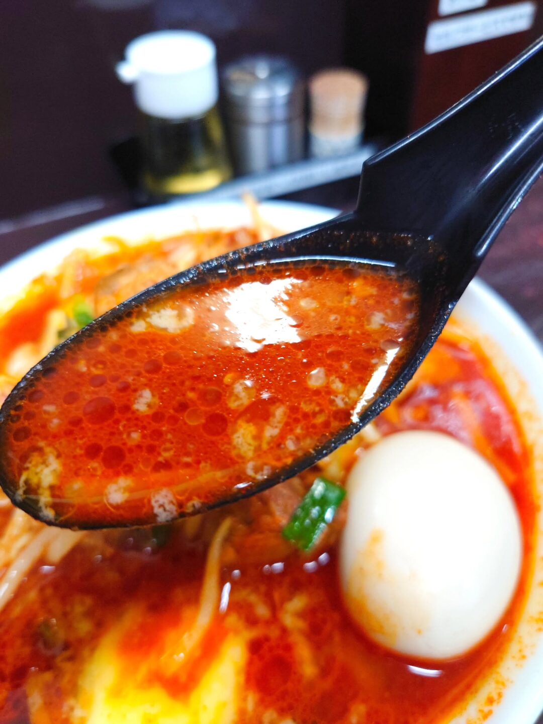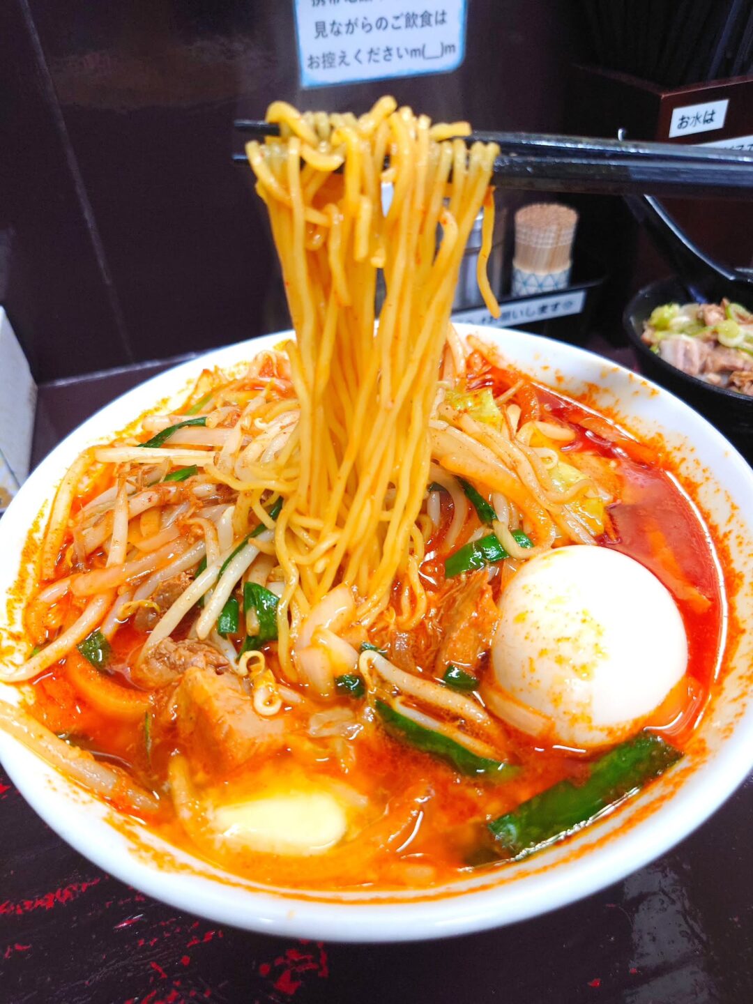 野菜の旨味が溶け込んだ旨辛スープに、硬め指定の細麺がしっかり寄り添い、改めて完成度の高さを実感します。