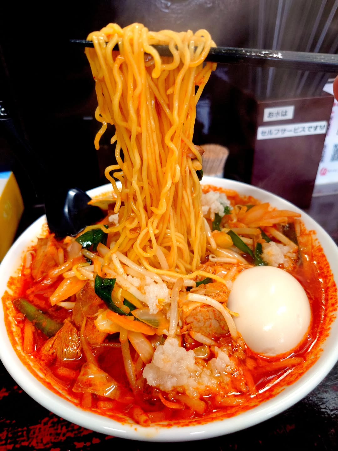 - 野菜の旨味がたっぷり溶け込んだ「中毒性のある辛旨スープ」と硬めの細麺