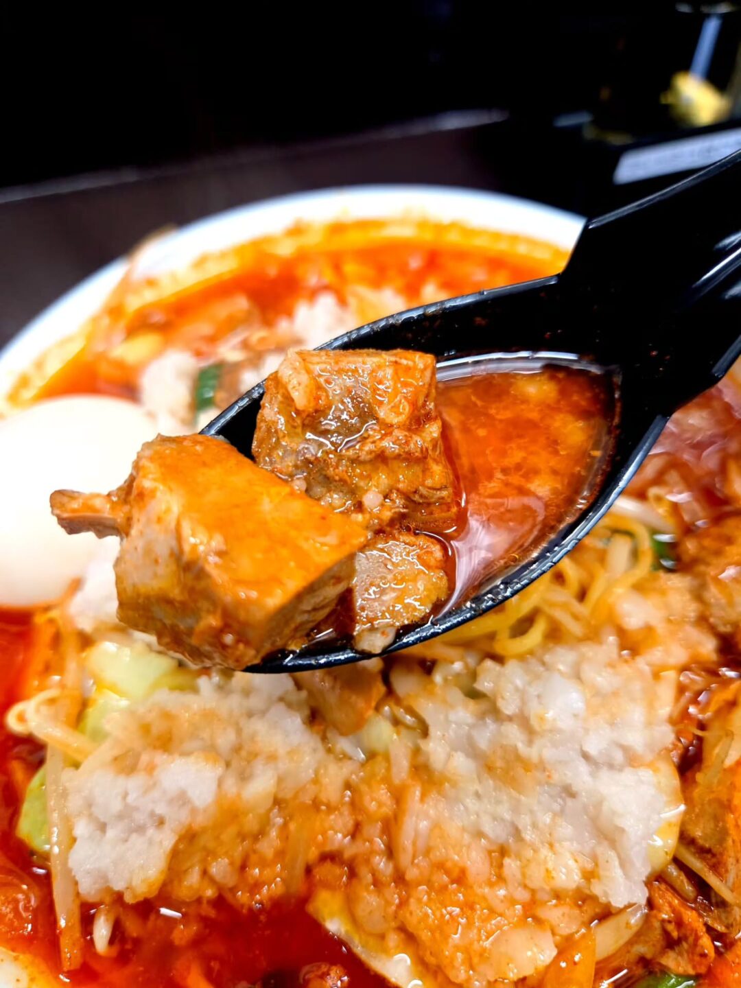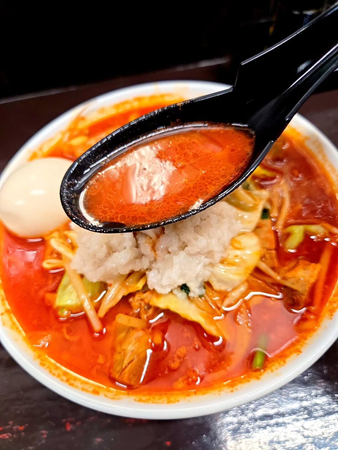 丼から立ち上るのは、野菜の旨味が溶け込んだ極上の旨辛スープ。