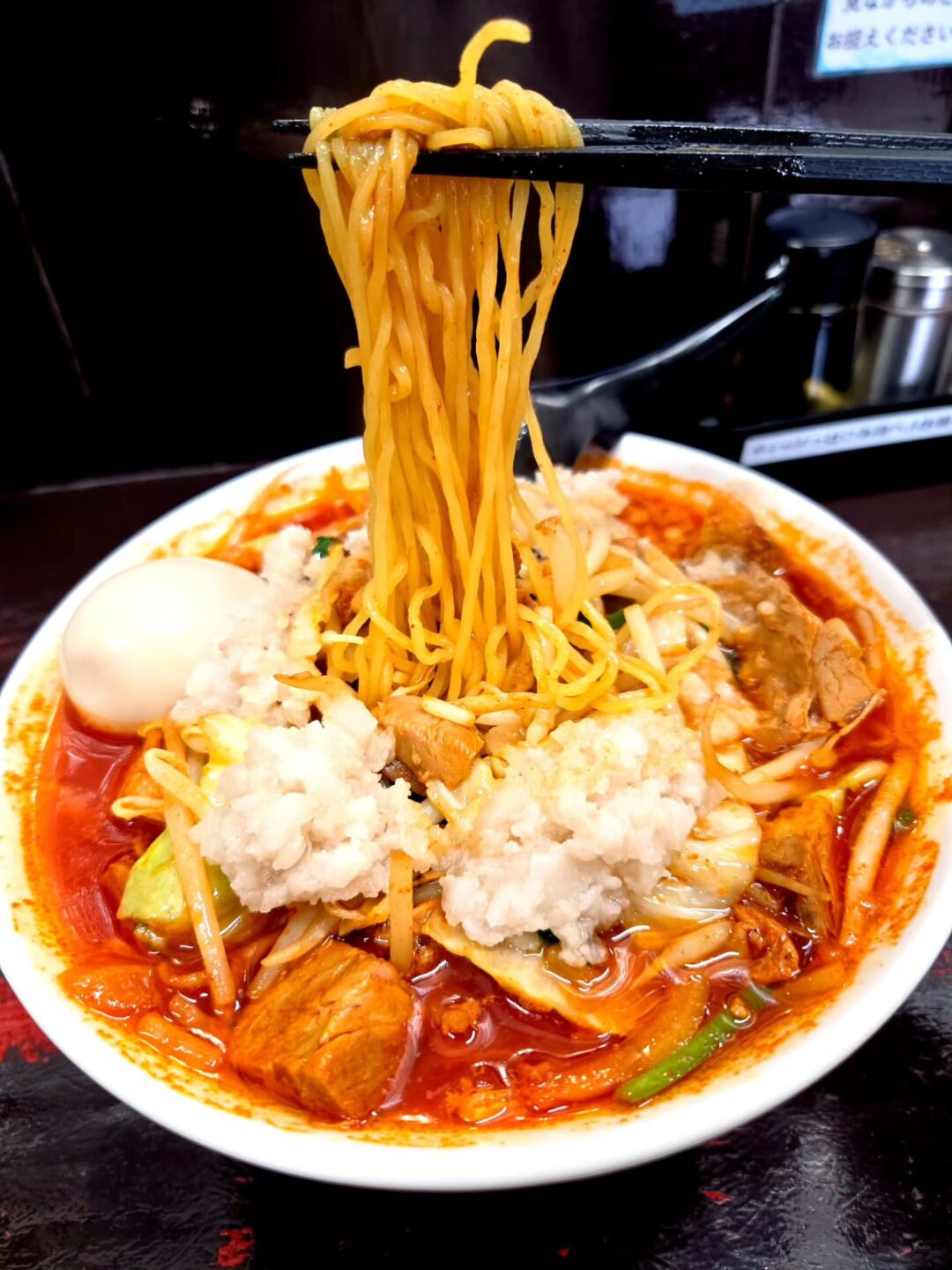 硬めオーダーで仕上げた細麺は、パツパツとした歯切れの良い食感。旨辛スープをしっかり持ち上げ、一体感のある味わいを生み出します。