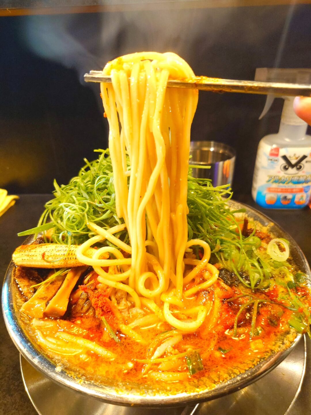 中太ストレート麺はスープの刺激をしっかり抱え込み、口の中で心地よい存在感を発揮します。