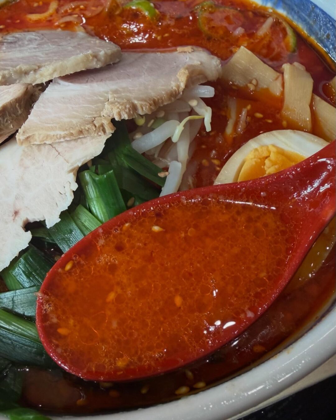 トッピングのニラやもやしはシャキシャキとした食感が心地よく、濃厚なスープとの相性も抜群。