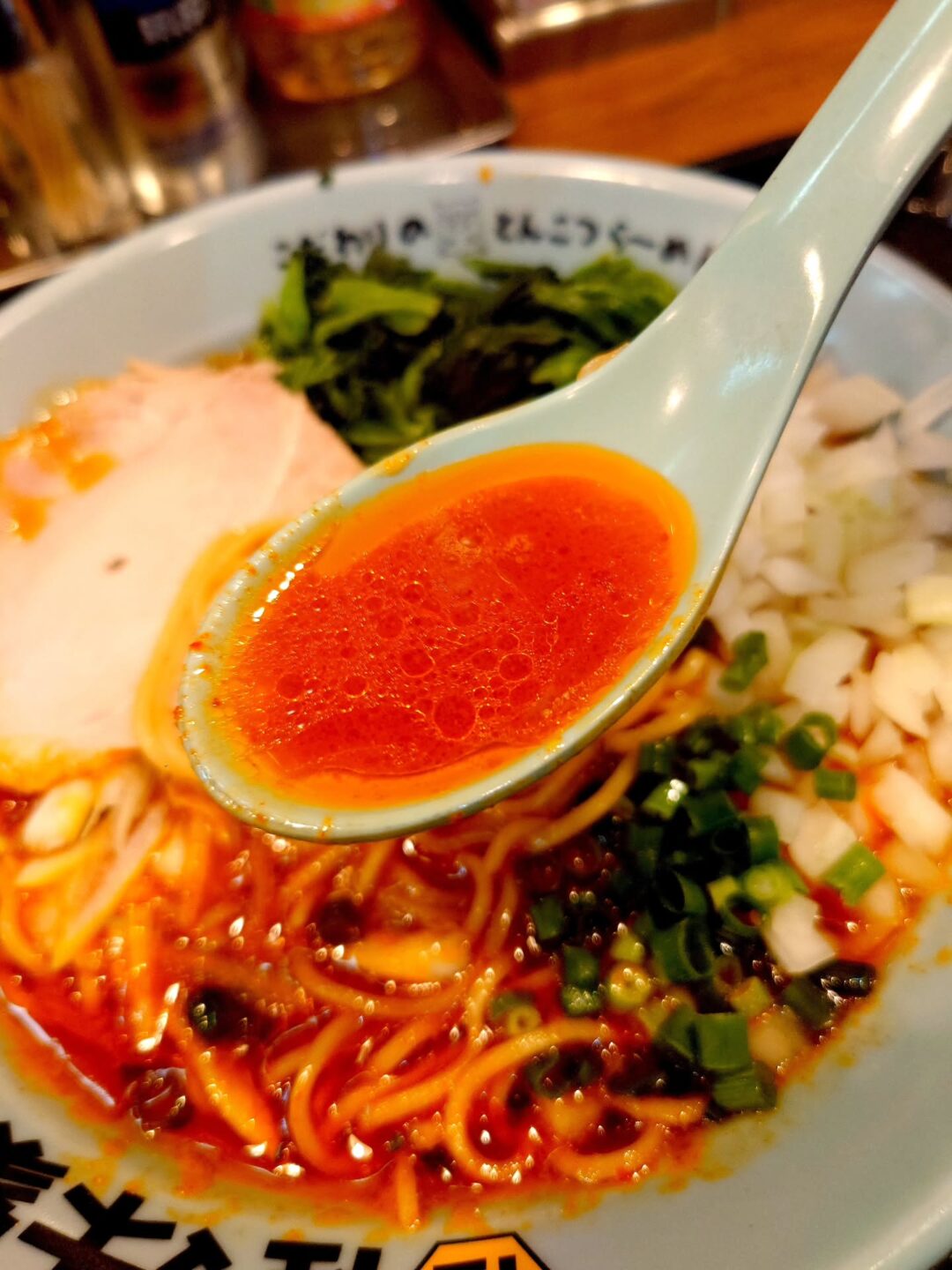 豚骨ベースの濃厚スープに、刺激的な辛味が重なり合う一杯。