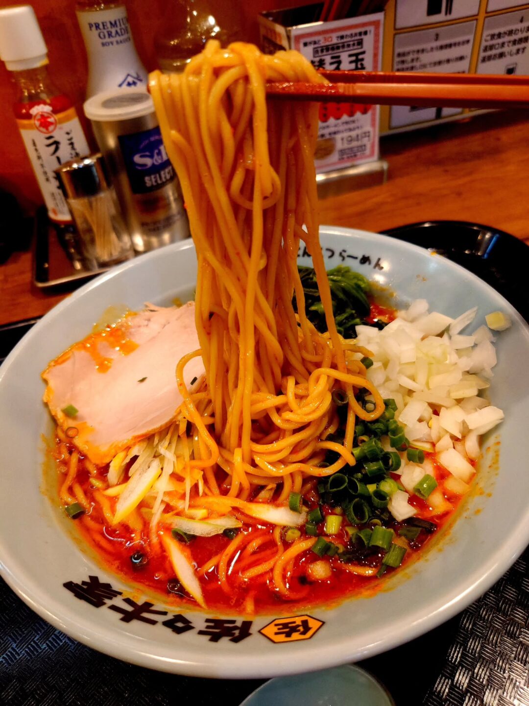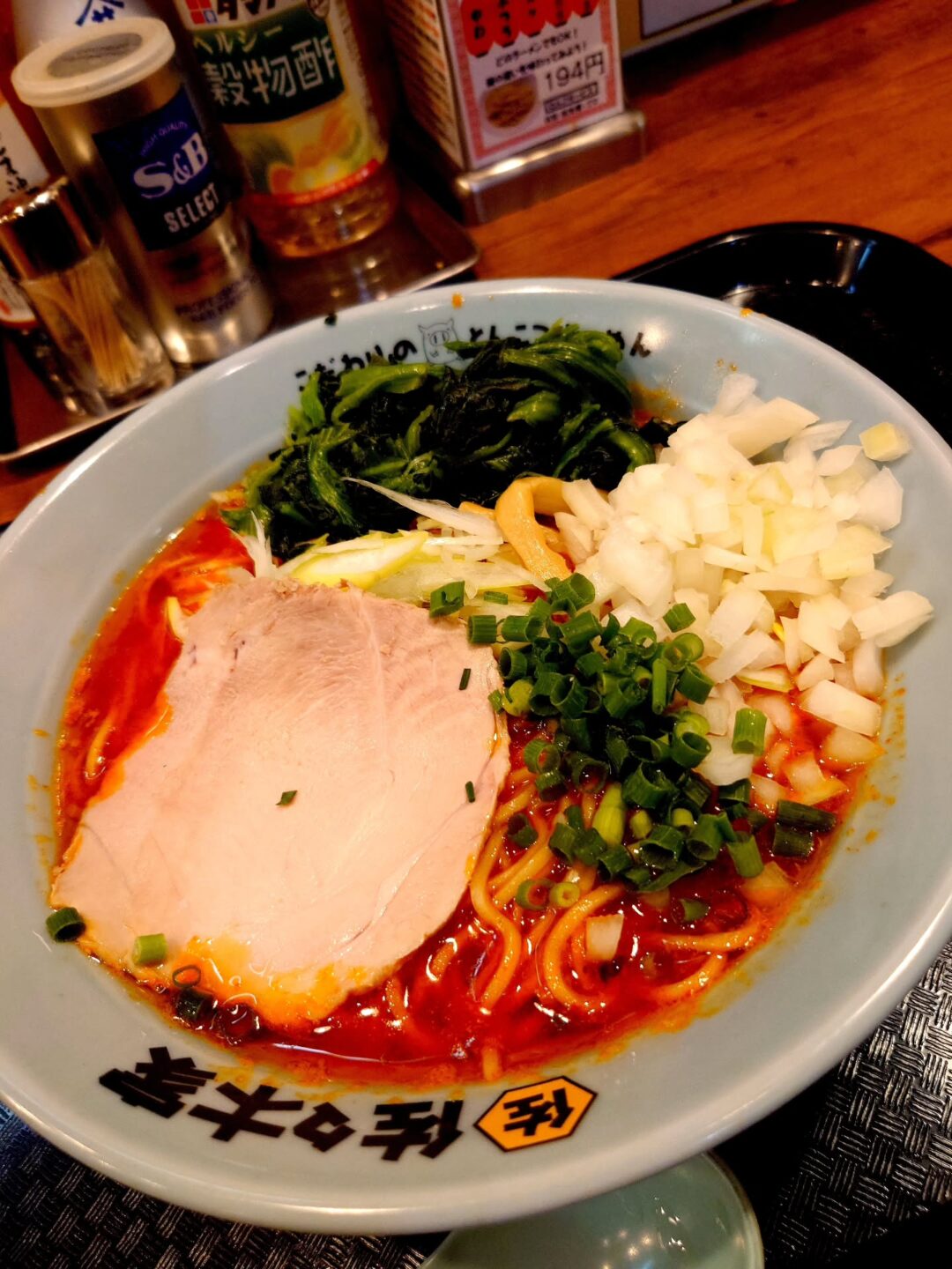 今回はほうれん草と玉ねぎをトッピングし、さらに替玉も追加しました。