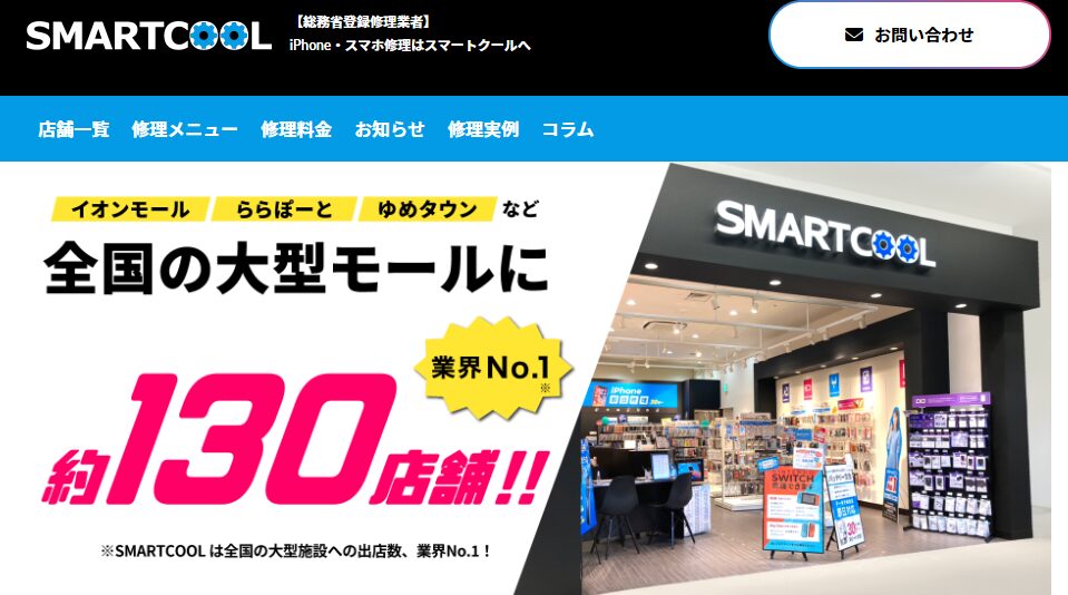 「スマートクール」は、スマートフォンのバッテリー交換や画面修理、水没対応などを行う修理専門店。