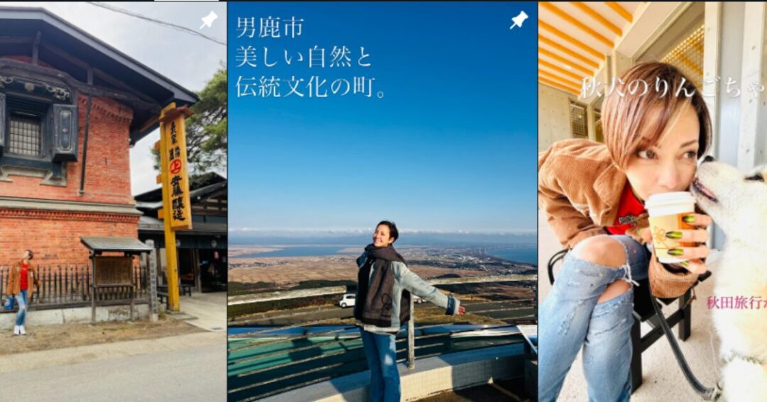 投稿では、秋田犬と一緒に撮影した写真のほか、男鹿市を訪れた様子も確認できます。