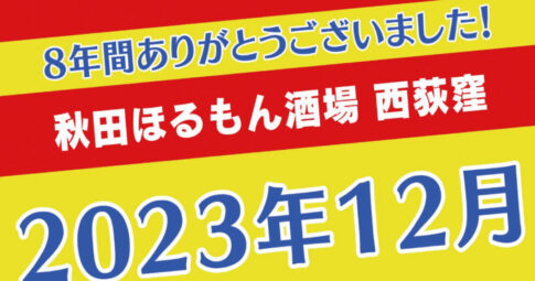 オープン・クローズ2023年12月半ばに、東京都杉並区西にある居酒屋「秋田ほるもん酒場 西荻窪」が閉店することが公式エックスで明らかになりました。詳しい閉店日時は後日お知らせがあるとのこと。 今年11月1日、2日には8周年イベントとして、…
