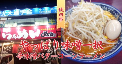 ラーメン【秋田市】濃厚辛味噌×バター×コーン!「めん丸新国道店」の人気ラーメンレビュー。本日の麺活・サラリーマン佐藤