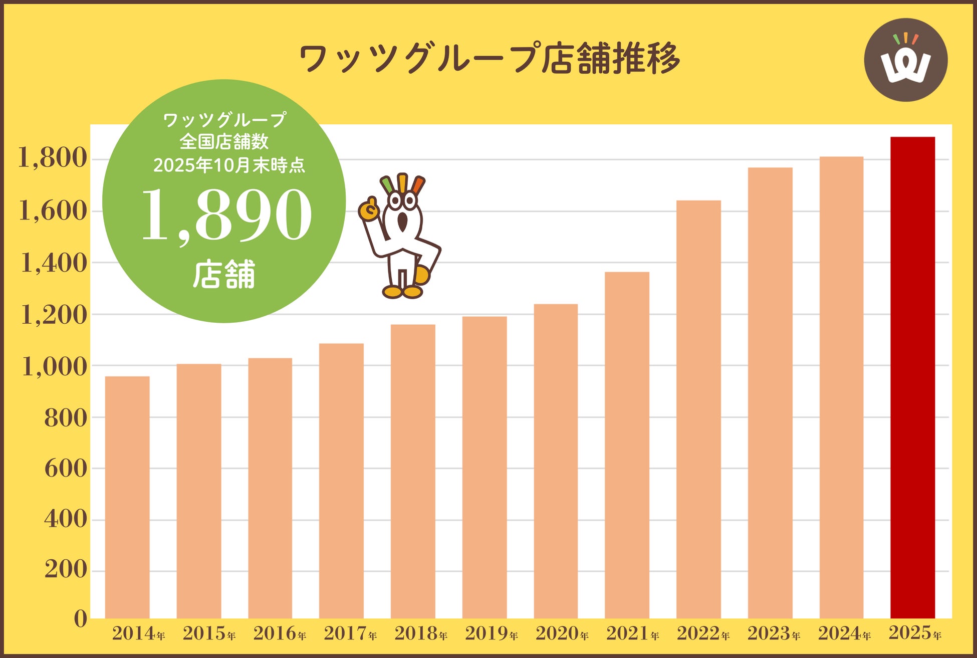 ワッツは2014年より店舗数を全国各地において増加させており、2025年10月末時点にて、全国店舗数1,890店舗を達成いたしました。
