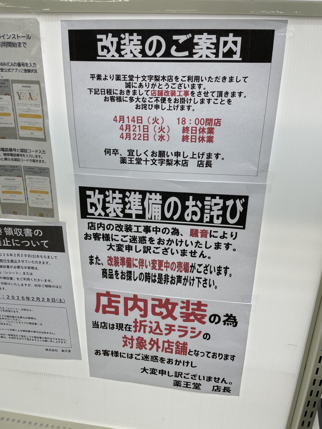 薬王堂十文字梨木店で、改装工事に伴う営業時間の変更および臨時休業が発表されていました。