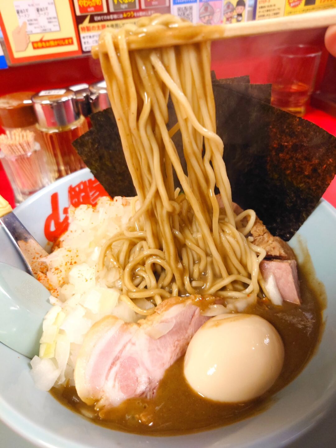 山岡家特有の濃厚豚骨とガツンと効いた煮干しの組み合わせは、毎年食べても衝撃があります!