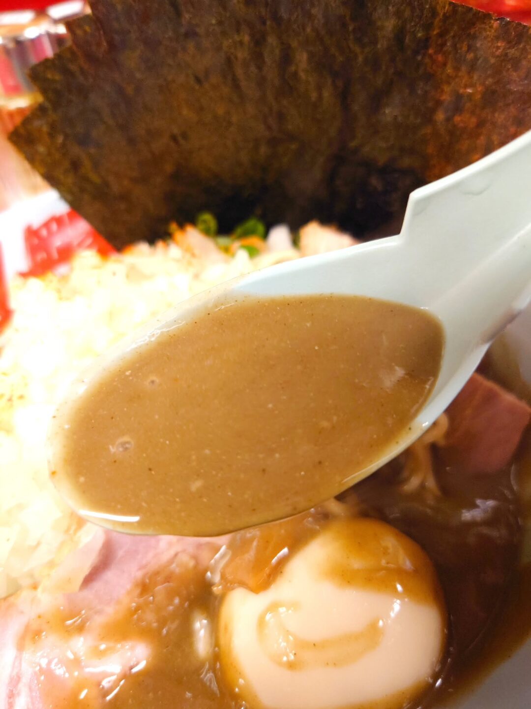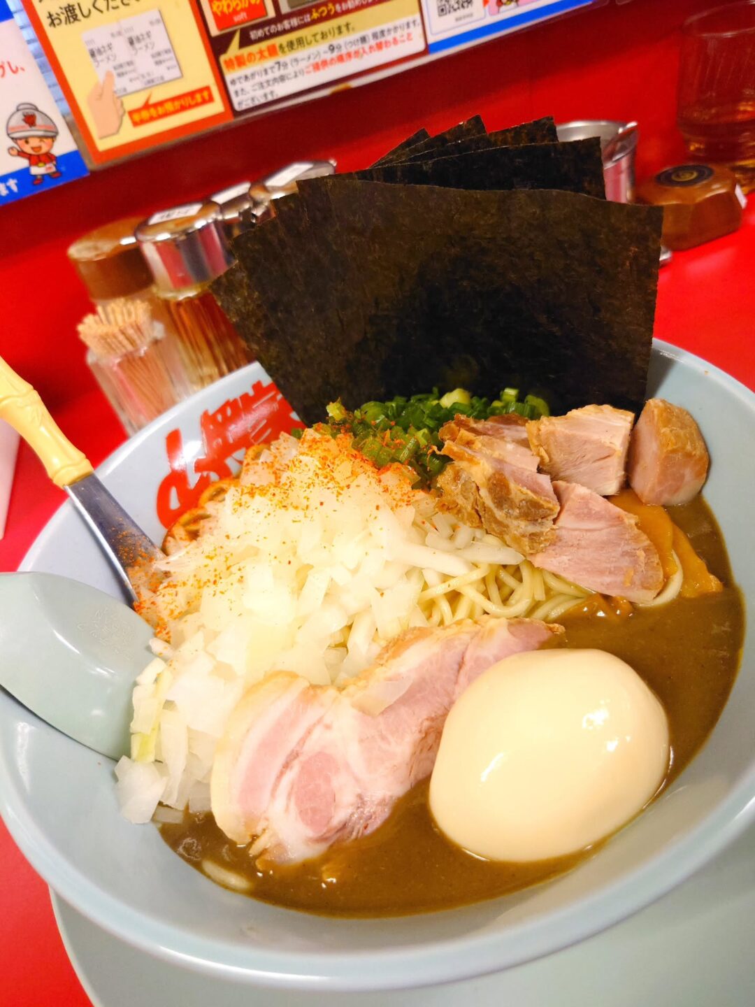 今回はトッピングも充実させ、味玉、玉ねぎ、海苔、コロチャーを追加しました。