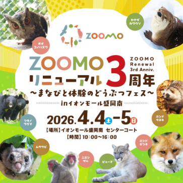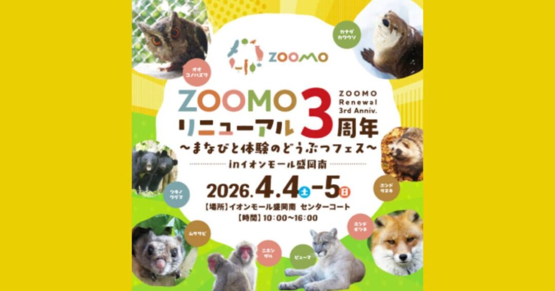 【2026年4月4日・5日】「ZOOMOどうぶつフェス」がイオンモール盛岡南で開催!ZOOMOリニューアル3周年